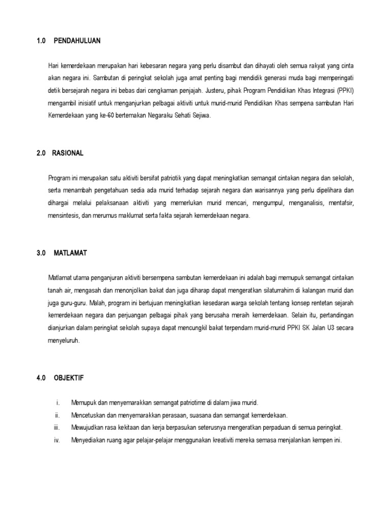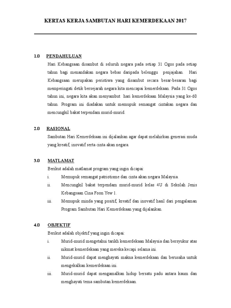 Kertas Kerja Sambutan Bulan Kemerdekaan. Contoh Kertas Konsep Sambutan Hari Kemerdekaan Kebangsaan.