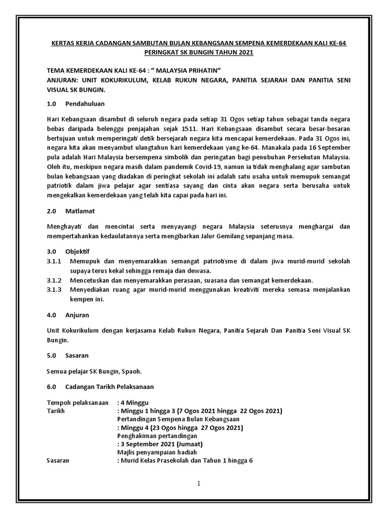 Kertas Kerja Sambutan Bulan Kebangsaan Sk Bungin 2021 Pdf